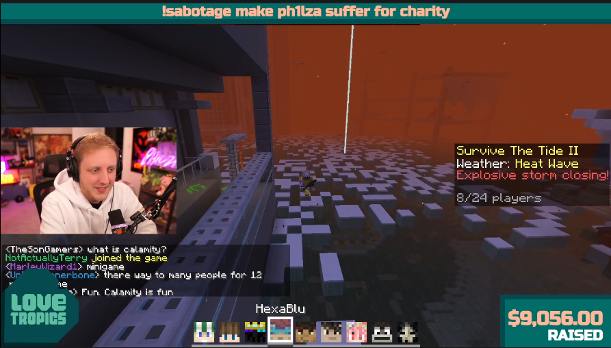 Love Tropics is an annual 48-hour livestreamed charity event held in Minecraft. Over the course of two days dozens of hosts—big and small—from in and around the minecraft community come together to raise money for various climate change related charities.